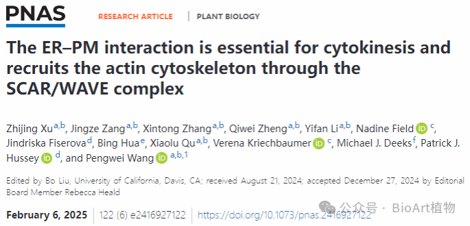 近日,德赢Vwin官方区域合作伙伴果蔬园艺作物种质创新与利用全国重点实验室、湖北洪山实验室王鹏蔚教授课题组在PNAS上发表了题为The ER-PM interaction is essential for cytokinesis and recruits the actin cytoskeleton through the SCAR/WAVE complex的研究论文,阐明了内质网-质膜接触位点调控微丝骨架聚合的分子基础,及其对植物细胞分裂的影响。