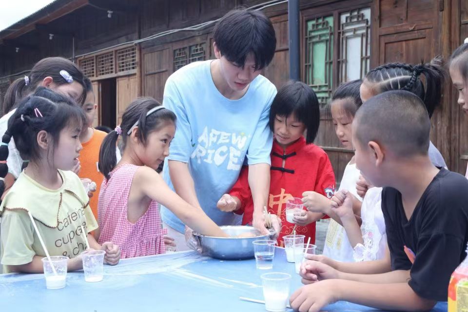 官坝村的暑期课堂展开了一场别开生面的化学探索,实践队员聚焦于非牛顿流体的神秘特性,用讲解与实践相结合的方式,指导小朋友们用日常生活中常见的淀粉制作非牛顿流体,亲自体验它“吃软不吃硬”的特性——轻抚如丝般顺滑,重击则如石般坚硬,感受高分子化学的无限奥秘。“非常奇妙!使劲戳它时,它纹丝不动,但要是缓慢地伸进去就毫不费力。”一个小朋友分享道。
