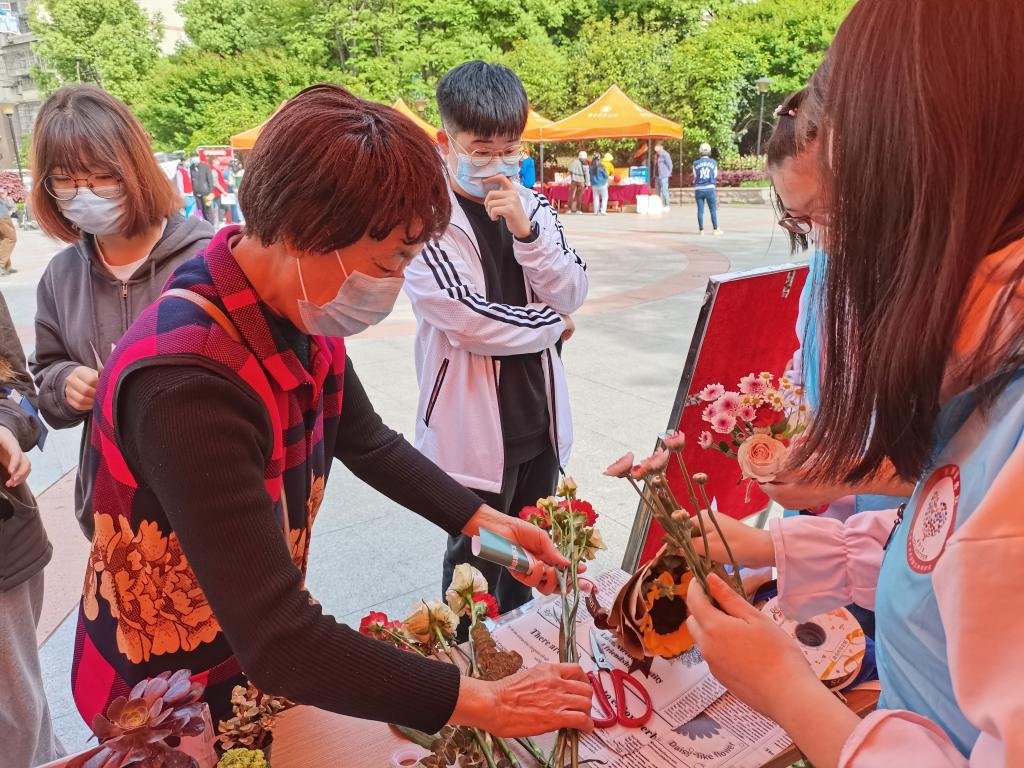 活动伊始,志愿者分为两组,一组负责手捧花的制作,通过介绍已经提前制作好的手捧花样品,让居民对本次活动有一个初步了解,提高参与热情。在讲解结束后,居民们利用提前准备好的花材进行自由创作,志愿者们在旁积极提供帮助与指导,并对花束进行包装和修饰。