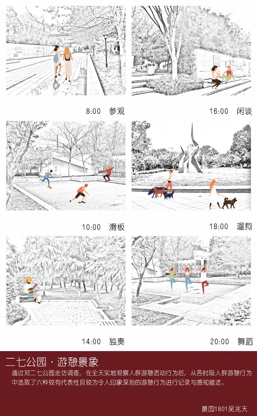 “这是一个怎样的世界?“景园1802班的孙长虹在调研之后产生了这样的思考。在他的作品《二七公园的一天》中,红色与蓝色交织,通过一天不同的时间点串联起二七公园不同的活动空间以及人在空间中不同的行为心理。孙长虹谈道:”二七公园具有十分厚重的革命历史底蕴,它与京汉铁路大罢工这一历史事件密切相关,所以我希望能够通过对二七公园的更新改造设计重新塑造城市居民的精神之所,让人们在公园中可以充分感受到革命的奋斗精神,铭记历史和革命先烈的无私奉献。“景园1801班的吴兆天通过对二七公园走访调查,在全天实地观察人群游憩活动行为后,从各时段人群游憩行为中选取了六种比较典型的行为进行了记录与感知描绘。作品《重返“二七”》是景园1802班孟辰玥的作品,她用细腻的笔触描绘了人们在二七公园的行为活动。